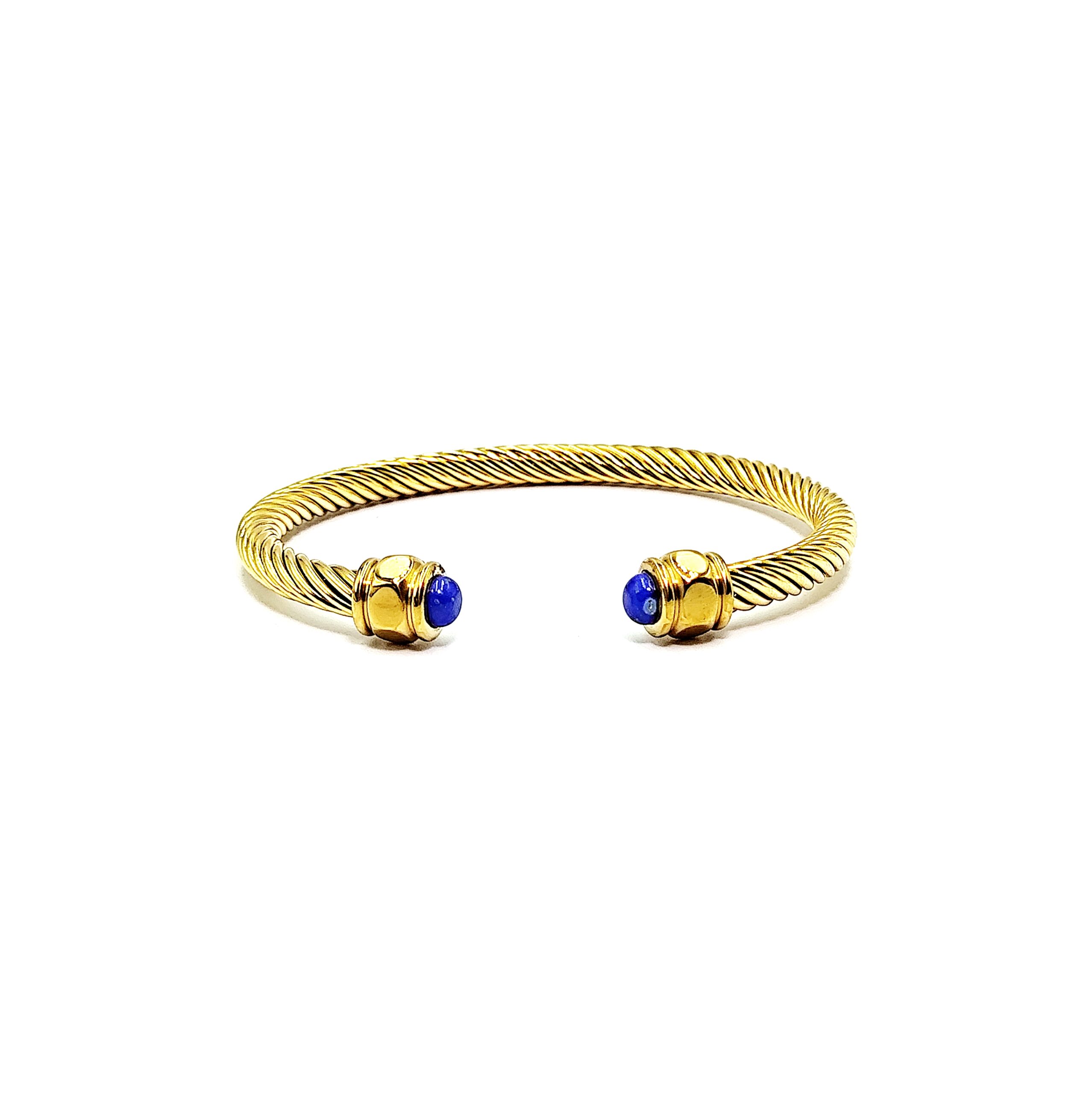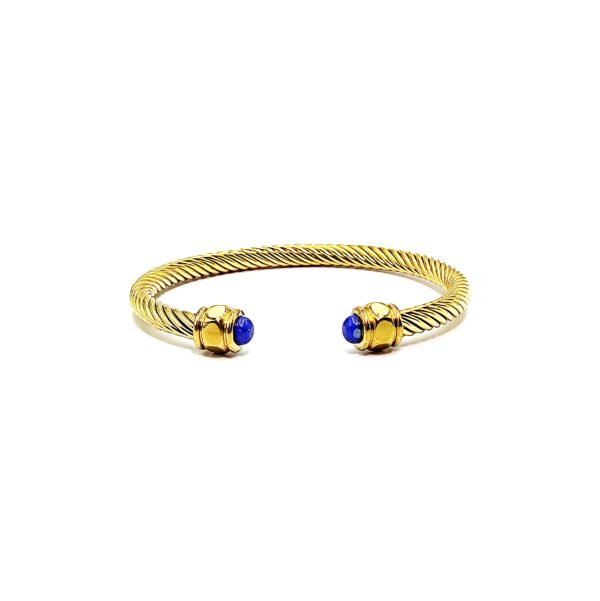Ατσάλινο βραχιόλι – χειροπέδα, επιχρυσωμένη με στριφτό σχέδιο & μπλε πέτρα.