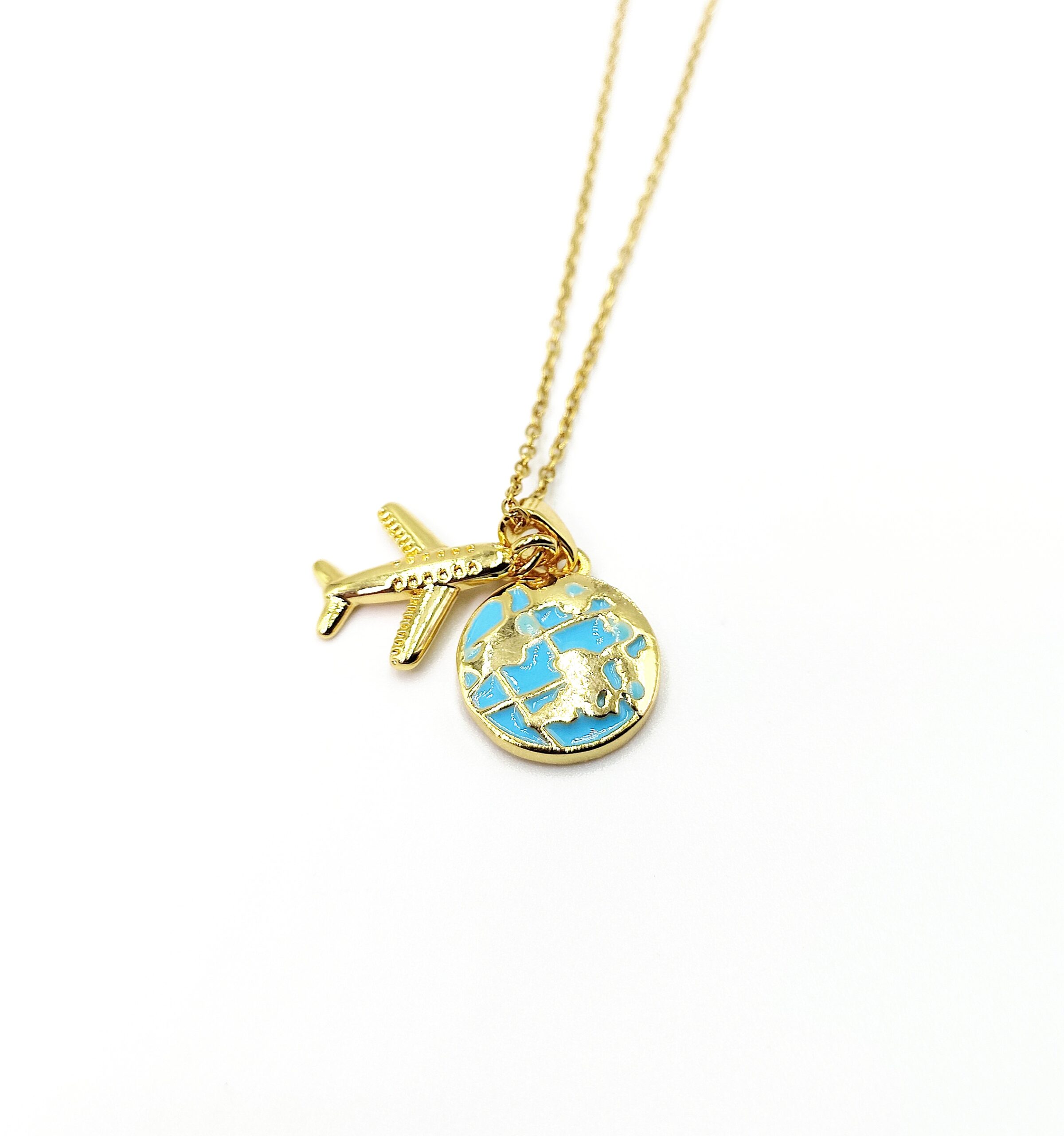 Ατσάλινο κολιέ αλυσίδα επιχρυσωμένο με μοτιφ αεροπλάνο & Γη. Μήκος 40cm & 5cm προέκταση.