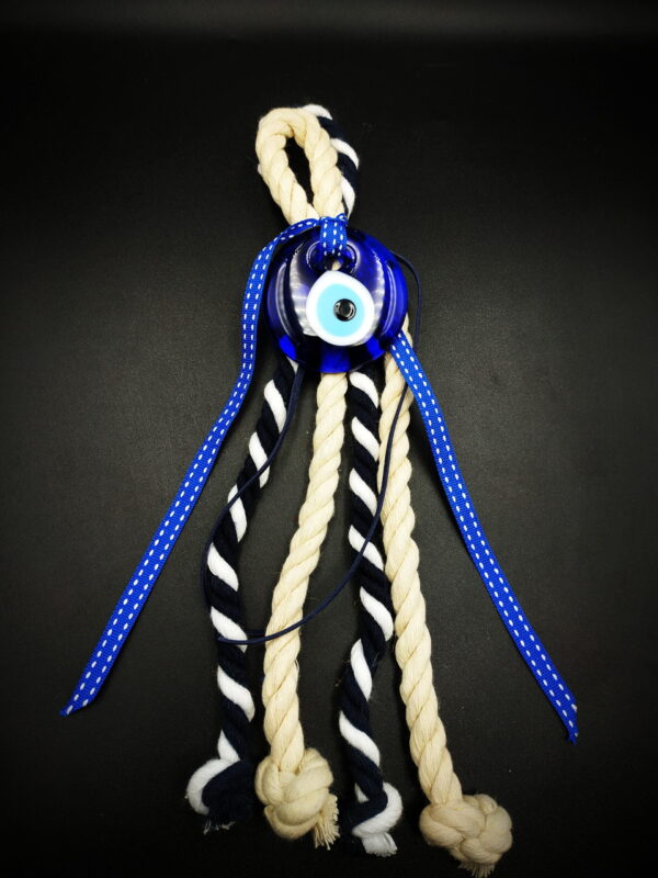 Χειροποίητο κρεμαστό γούρι μάτι, με κορδέλες και σκοινιά 28cm