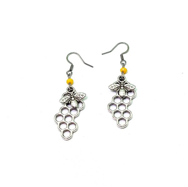 Κρεμαστά Σκουλαρίκια με μεταλλική κερήθρα & μέλισσα, με ατσάλινο κούμπωμα.