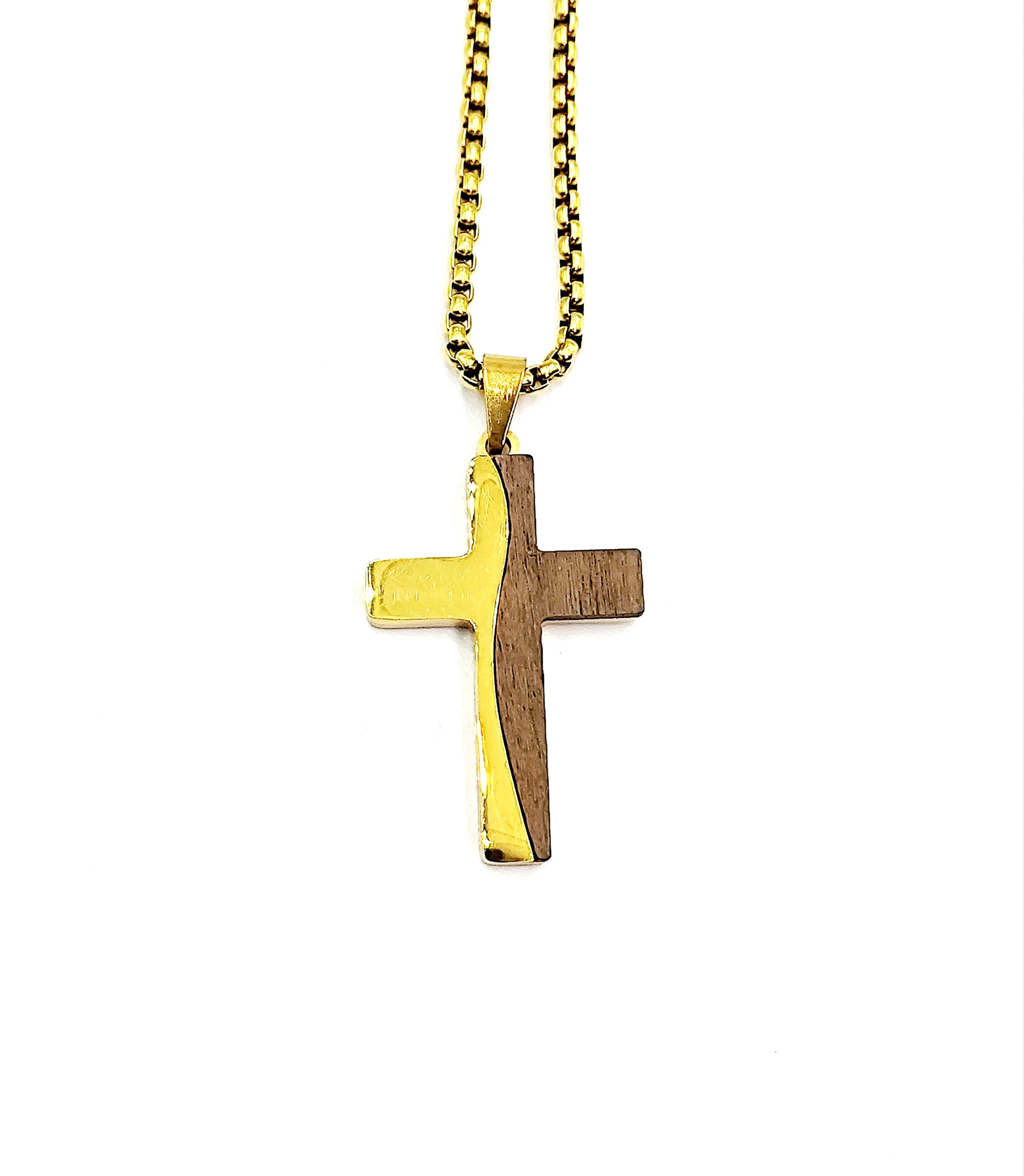 Επίχρυσο Κολιέ Σταυρός από Ατσάλι & Ξύλο