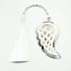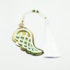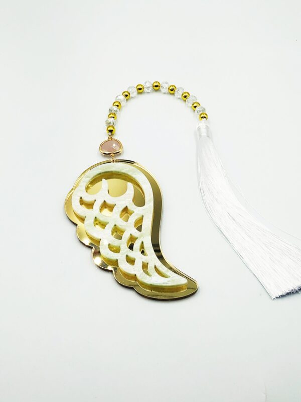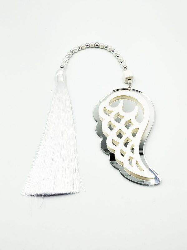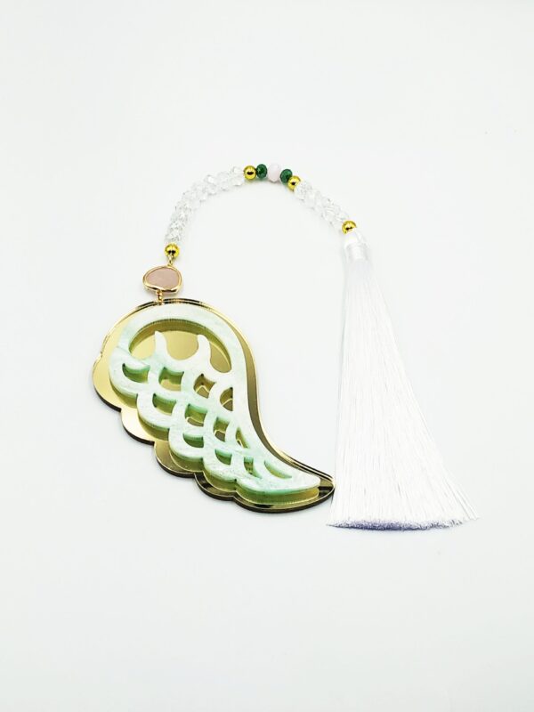 Επιτραπέζιο γούρι με πλέξιγκλας φτερό , χάντρες & λευκή φούντα 14cm. Πλήρες μήκος 40cm.